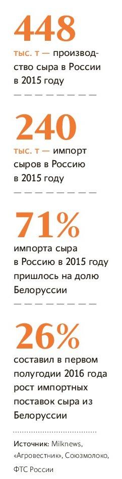 Пока главными приобретателями выгоды от эмбарго выглядят не российские фермеры, а белорусские компании: по словам Марины Петровой, в первом полугодии 2016 года импорт сыра из Белоруссии в Россию вырос на 32,5%, до 79,5 тыс. т, а доля республики в общем объеме импорта достигла 86%. Емкость всего российского рынка сыра в первом полугодии 2016 года Петрова оценивает в 310 тыс. т в натуральном выражении. Это на 8% больше, чем за тот же период прошлого года, но в основном за счет импорта — производство сыра в России за это время выросло лишь на 1,5%. «Полное насыщение рынка из расчета 6 кг сыра на человека в год возможно не раньше, чем через Окончание → семь-десять лет. И важно добиться того, чтобы эти сыры были российскими, а не импортными», — подводит итог Марина Петрова.