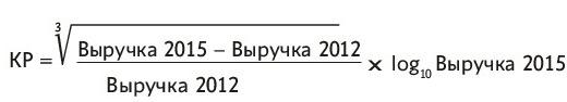 На втором этапе составления рейтинга мы рассчитали итоговый балл — коэффициент роста (КР) для всех компаний — участниц лонглиста. Необходимость введения подобного коэффициента обусловлена разностью масштабов бизнеса: динамики роста выручки с 1 млрд до 5 млрд руб. и с 20 млрд до 50 млрд руб. должны иметь разный вес. Итоговый балл рассчитывался по формуле:
