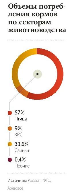 В зависимости от цен на зерно и премиксы доля кормов в себестоимости производства птицы или свиней на убой составляет от 65 до 75%, подсчитал для журнала РБК председатель мясной ассоциации России Сергей Юшин.