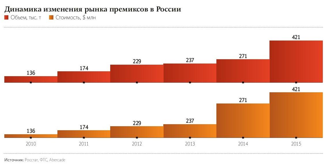 И в «Мегамикс» не сомневаются, что все расходы на завод и оборудование окупятся. По данным Росстата и Федеральной таможенной службы, российский рынок премиксов со 136 тыс. т в 2010 году увеличился до 271 тыс. т в 2014 году (в денежном выражении он за это время увеличился со $185 млн до $576 млн). Правда, партнер исследовательской компании Abercade Надежда Орлова в интервью журналу «Агроинвестор» говорила, что на самом деле рынок еще больше. «На основе интегрированных данных по результатам опроса производителей и с учетом государственной статистики реальный объем рынка премиксов в 2014 году составил примерно 330 тыс. т на $430–440 млн», — уточняла она.