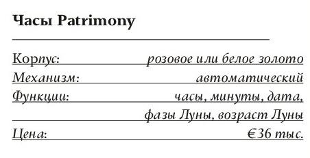 Новые часы Patrimony в полной мере демонстрируют приверженность марки чистому минималистичному дизайну. Посеребренный циферблат не перегружен деталями и вместе с тем отображает два серьезных усложнения. Шкала даты расположена полукругом в верхней части циферблата, значения отмечает черная ретроградная стрелка с наконечником. Индикатор лунных фаз показывает не просто картину лунного диска, но и конкретный цикл от 0 до 29 с половиной дней. Механизм требует корректировки раз в 122 года.