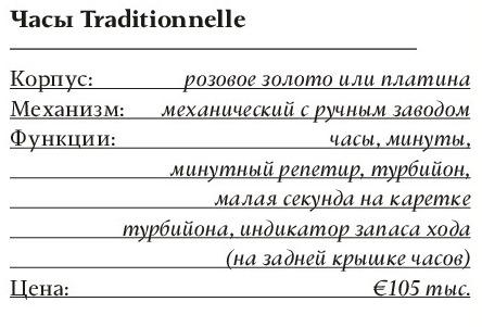 Салон высокого часового искусства SIHH состоится в Женеве только в январе, но о некоторых его новинках уже известно. Старейшая часовая мануфактура Vacheron Constantin анонсировала две модели уже в конце сентября. Одна из них — сложные и элегантные часы Traditionnelle. В новом мануфактурном калибре 2755 TMR объединены турбийон и минутный репетир, который активируется кнопкой с левой стороны корпуса. На циферблат вручную нанесен гильошированный узор. Минутная шкала в железнодорожном стиле немного смещена вверх, оставляя больше места для каретки турбийона в позиции «6 часов». Она изготовлена в форме фирменного мальтийского креста, только на полировку которого уходит до 11 часов работы. Часы продаются в комплекте с резонатором Music of Time, который служит для усиления громкости и гармоничного звучания гонгов минутного репетира.