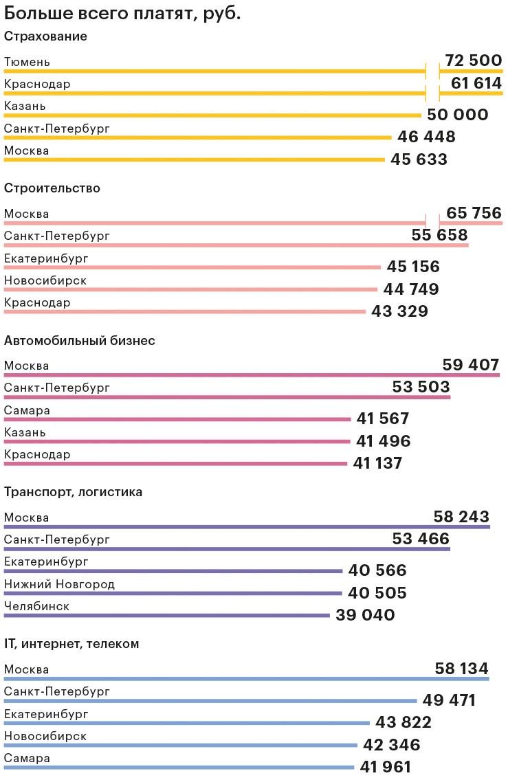 Самые высокие зарплаты у специалистов по страхованию в Тюмени — там им платят почти впяте ро больше, чем в Кемерово, московские строители зараба тывают вдвое больше оренбургских.