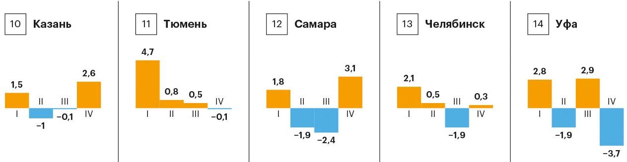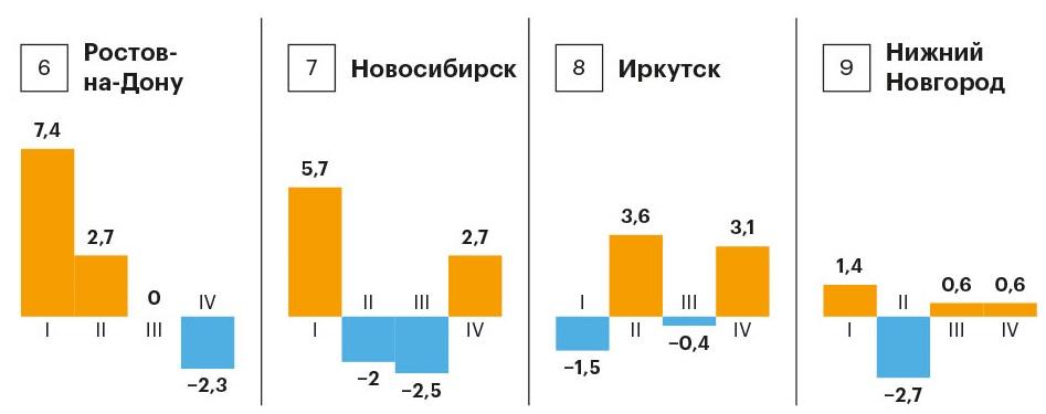 Подробная разбивка по отдельным кварталам и городам дает более сложную и неоднозначную картину. К примеру, в Красноярске значение индекса в четвертом квартале 2017 года выросло на 12,1 пункта, в Краснодаре — на 11,6 пункта, в Уфе и Омске за тот же период индекс упал на 3,7 и 4,8 пункта соответственно.