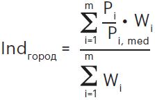 где Pi — цена товара в городе; Pi, med — цена товара в корзине; Wi — вес товара в корзине; m — число категорий, учтенных при расчетах индекса в городе.