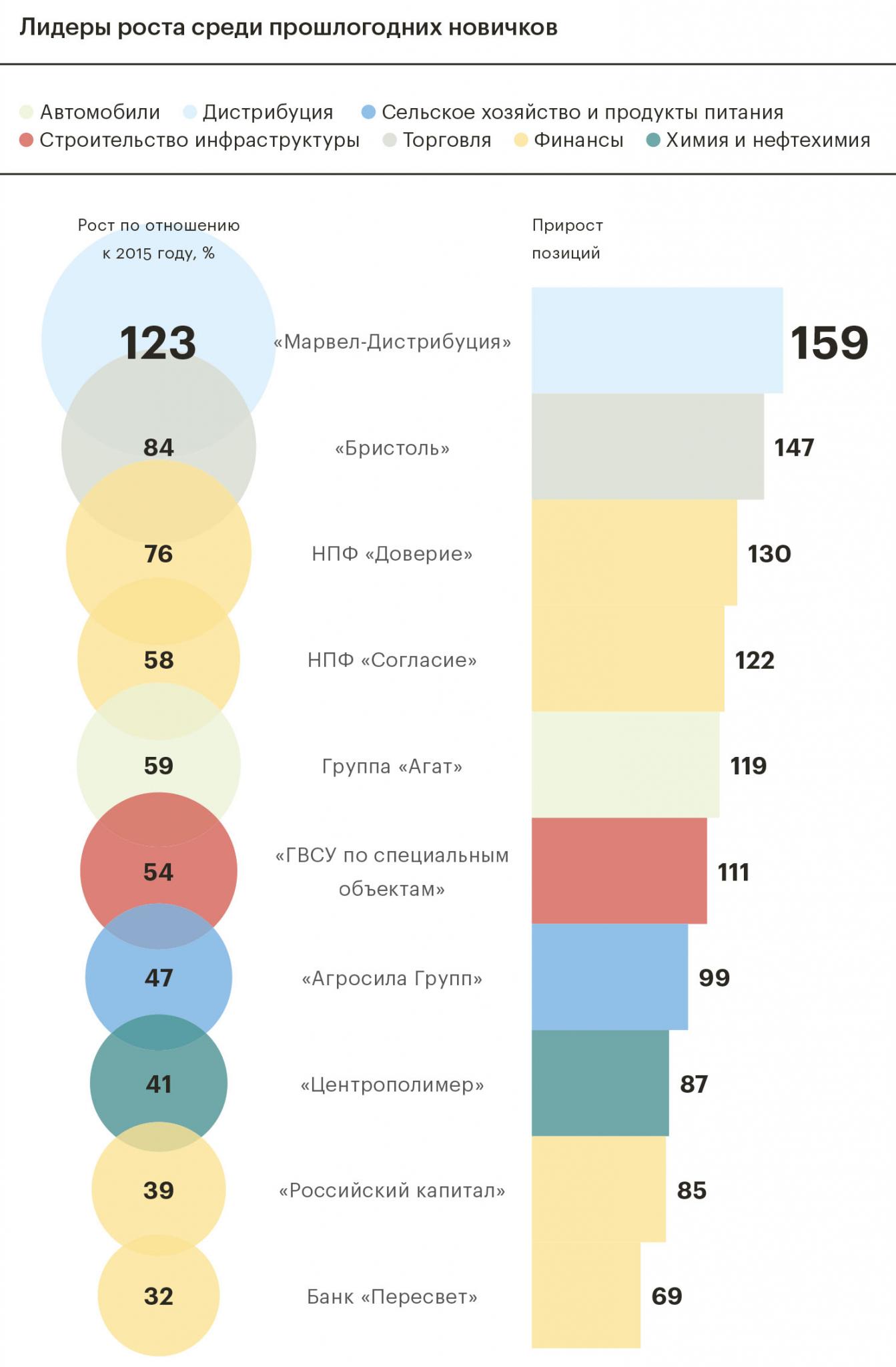 Лидером роста среди новобранцев 2016-го стала «Марвел-Дистрибуция», которая за год прибавила 159 позиций в рейтинге, а выручка по РСБУ увеличилась на 123%. Более половины доходов компании приносят поставки техники в розничные сети (дистрибьюторский портфель включает более 120 брендов, дилерская сеть — свыше 4,2 тыс. компаний): к примеру, продажи планшетов за год выросли на 302%, мобильных устройств — на 37%, рассказывали представители компании в феврале 2017 года.