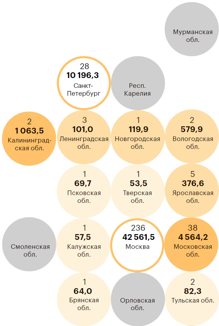 Для каждого региона показано количество компаний — участников рейтинга и их совокупная выручка (млрд руб.).