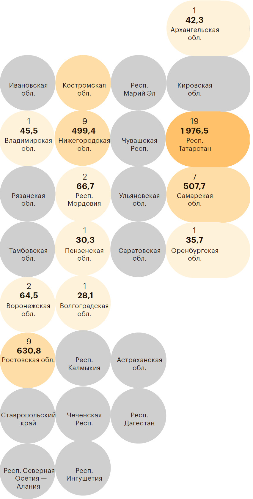 6-е место по выручке (2,3%), 4-е место по количеству компаний (19). Крупнейшая компания — «Татнефть»