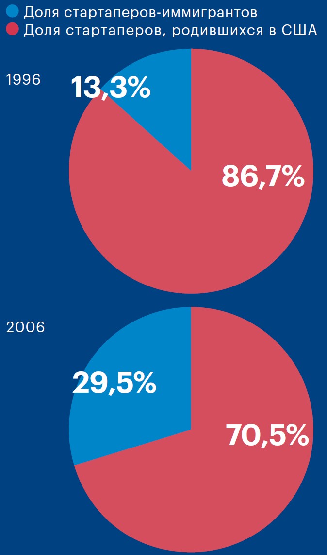 Имидж США как главной колыбели для предпринимателей со всего мира в 2017 году подпортил Дональд Трамп: с его подачи власти дезавуировали инициативу Барака Обамы по внедрению так называемой стартап-визы для лиц, готовых приехать в страну для развития молодых технологических компаний. Убедить президента-изоляциониста не помогли ни влиятельное лобби Кремниевой долины, ни апелляции к классической модели американской мечты. Между тем даже в нынешней конфигурации экономики США роль предпринимателей-иммигрантов огромна, прежде всего в передовых отраслях. Журнал РБК изучил исследования, подтверждающие этот тезис, — лучшую иллюстрацию позитивного эффекта «цифрового кочевничества».