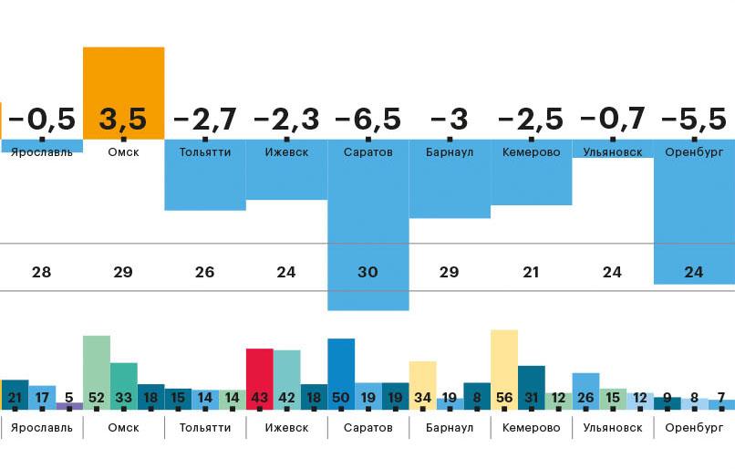 По итогам мониторинга второго квартала в 15 городах из 26, попавших в нашу выборку, цены в среднем по всем категориям снизились. Самым гуманным для потребителей с точки зрения цен оказался Саратов: стоимость корзины в среднем по всем наименованиям товаров и услуг упала на 6,5%.
