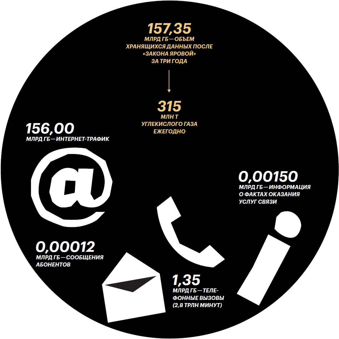 С июля 2018 года в России в полной мере заработал «пакет Яровой» — свод законов по борьбе с терроризмом и защите персональных данных россиян. Операторы связи должны три года хранить информацию о звонках, сообщениях и интернет-трафике граждан и предоставлять к ней доступ силовым органам по запросу. Весной 2016 года, когда законопроект еще был на обсуждении в парламенте, эксперты института «Гипросвязь» (дочерняя структура «Ростелекома») подсчитали, что объем хранящихся во исполнение требований закона данных за три года превысит 157 эксабайт, или 157 млрд Гб. По оценке авторов доклада, это в 100 тыс. раз больше объема данных о фактах оказания услуг, которые операторы хранили на тот момент.