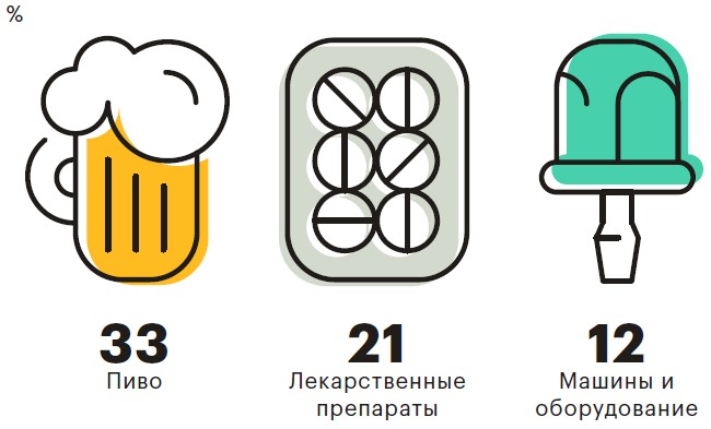 Но по поставкам лекарственных средств Германия впереди: Россия закупает у нее 21% от общего объема своего импорта. Аналогичная ситуация с пивом — на немецкие поставки приходится 33%, в 2017 году Германия нарастила физические объемы поставок своего пива в Россию практически в два раза.