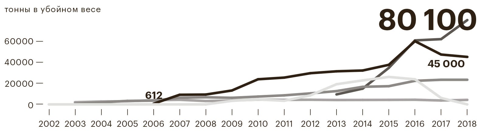 Несмотря на все беды, Ванеев не унывает: основные силы он уже переключил на свой второй по величине бизнес — производство и продажу утки (компании «Донстар» и «ТД Утолина»). По данным пресс-службы «Евродона», агрокомплекс с начала 2018 года произвел 22 тыс. т мяса утки и до конца года выпустит еще 2,2 тыс. т. По словам Ванеева, компания пока работает в ноль, но в ближайшие месяцы он надеется вывести бизнес в плюс.