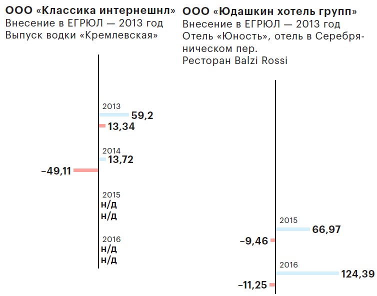 Забавно, но судя по СПАРК, у Юдашкина никогда не было долей в «Юдашкин хотель групп». В момент регистрации в 2013 году собственником компании был вице-президент Российского футбольного союза Сергей Анохин, бывший вице-президент «ИФК Бизнес-Технолоджис». В 2015-м Анохин продал «Юдашкин хотель групп» бывшему гендиректору «ТНТ Продакшн» Алексею Величко. В «Юдашкин хотель групп» сказали, что передали вопросы РБК руководителю, но ответов на них не последовало. В управлении «Юдашкин хотель групп» — отель «Юность» на 200 номеров на Хамовническом Валу и ресторан Balzi Rossi на Садовой-Кудринской. По данным СПАРК, компания до сих пор была убыточной: 2016 год она закончила с чистым убытком 11,2 млн руб. при выручке 124 млн руб., данные за 2017 год пока не опубликованы.