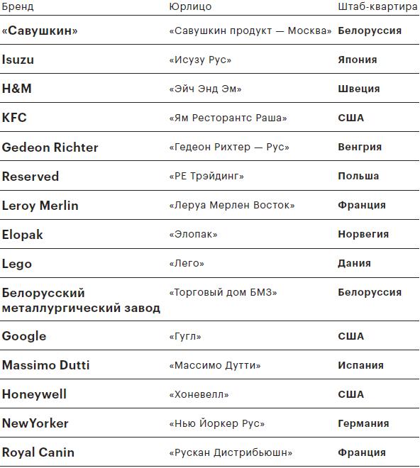 Первое место в «рейтинге иностранцев» заняла белорусская компания «Савушкин продукт — Москва», входящая в группу «Санта» Александра Мошенского и представленная в России большим количеством молочных продуктов семи разных брендов. При этом белорусские компании, как и французские, представлены в рейтинге дважды, а лидируют в этом смысле американцы, у которых три места, — это сеть фастфудов KFC, интернет-гигант Google и корпорация Honeywell, поставщик систем автоматизации и электронного управления.