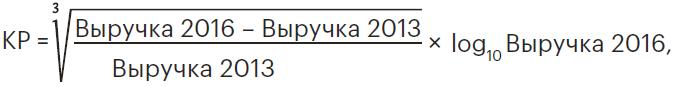 На втором этапе составления рейтинга был рассчитан итоговый балл — коэффициент роста (КР) для всех компаний — участниц лонг-листа. Необходимость введения подобного коэффициента обусловлена разностью масштабов бизнеса: динамика роста выручки с 1 млрд до 5 млрд руб. и с 20 млрд до 50 млрд руб. должна иметь разный вес. Итоговый балл рассчитывался по формуле:
