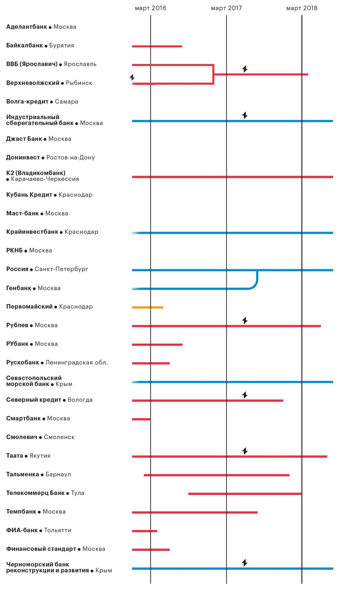 Первым пал «Донинвест», совладельцем которого был продюсер легендарной группы «Ласковый май» Андрей Разин. Лицензия у банка была отозвана в октябре 2014 года, спустя несколько месяцев после открытия одного офиса в Симферополе. Как выяснилось впоследствии в рамках процесса банкротства, для вывода денег использовались, помимо всего прочего, фиктивные сделки с недвижимостью в Крыму. Основная «зачистка» произошла в 2015–2017 годах, когда из-за действий Центробанка полуостров лишился 45% общего числа пришедших банков (13 кредитных организаций). В 2017–2018 годах аналогичная участь постигла еще четверть учреждений. Лишь к двум, Крайинвестбанку и Генбанку, была применена более мягкая мера надзорного реагирования — введение временной администрации и дальнейшая санация. У обоих в числе акционеров было государство.