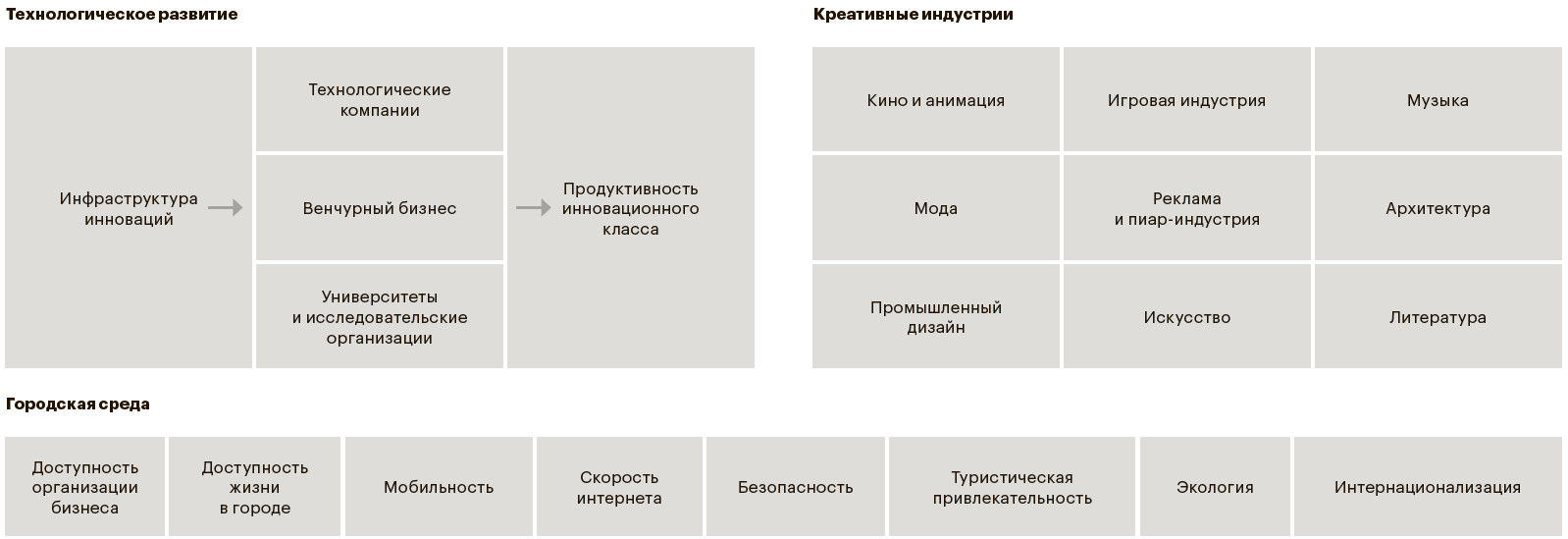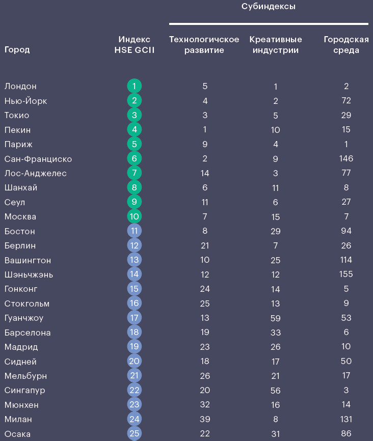 Уровень развития урбан-среды менее всего разделяет города-лидеры. Но здесь важно другое: современные технологии, например публичный Wi-Fi, покупают и внедряют почти все города мира, однако масштабно создают инновации и притягивают творцов технологий и смыслов лишь единицы.