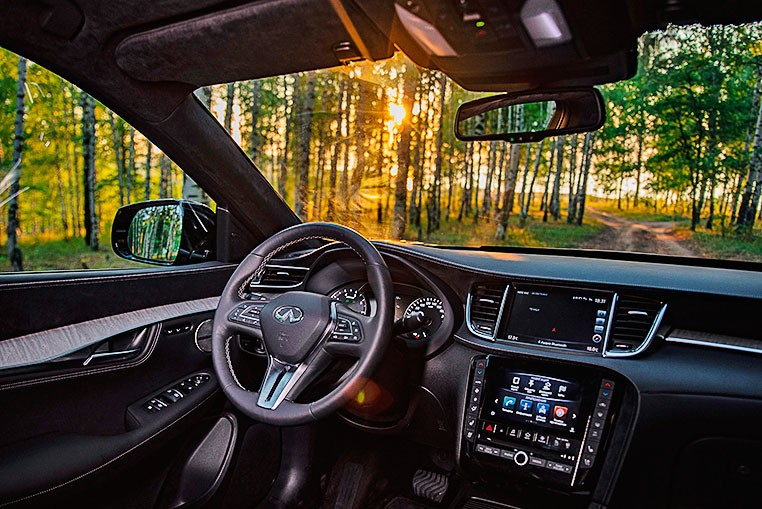 Внутри Infiniti — кресла из полуанилиновой кожи, вставки из натурального клена и множество опций. Например, QX50 можно заказать с системой кругового обзора, огромным проекционным дисплеем и продвинутой системой мультимедиа, которая понимает все современные цифровые форматы.