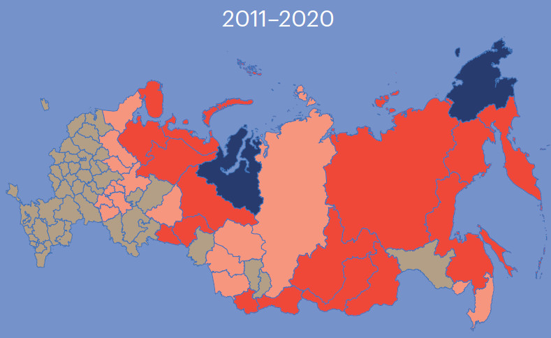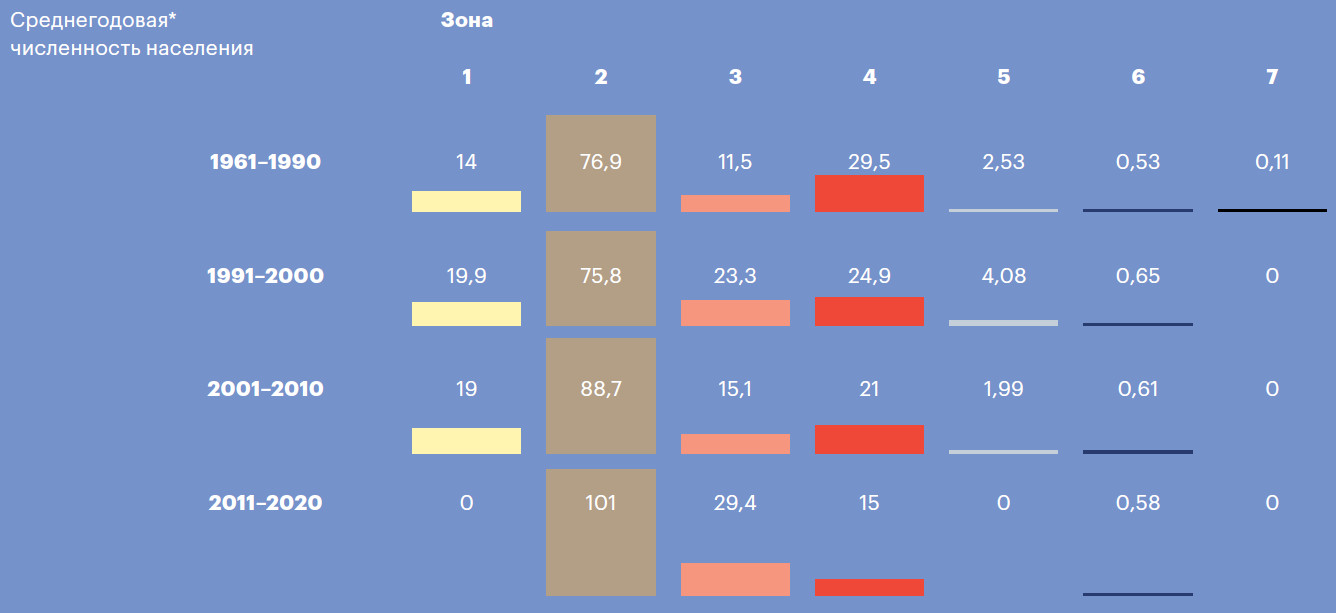 Авторы исследования утверждают: изменение природно-климатических условий в течение постсоветского периода затронуло десятки миллионов человек, особенно заметно в сторону улучшения — на Урале, юге Западной Сибири и Дальнего Востока (всего 19 регионов), в сторону ухудшения — на юге Европейской территории России и в Поволжье (всего 15 регионов). Масштабы климатических изменений заметно опережают сдвиги в расселении, но оба фактора работают в одном направлении — в сторону концентрации населения в районах с более благоприятными условиями, так что в период 2011–2020 гг. на две наиболее благоприятные зоны (2 и 3) стало приходиться почти 90% численности населения России.