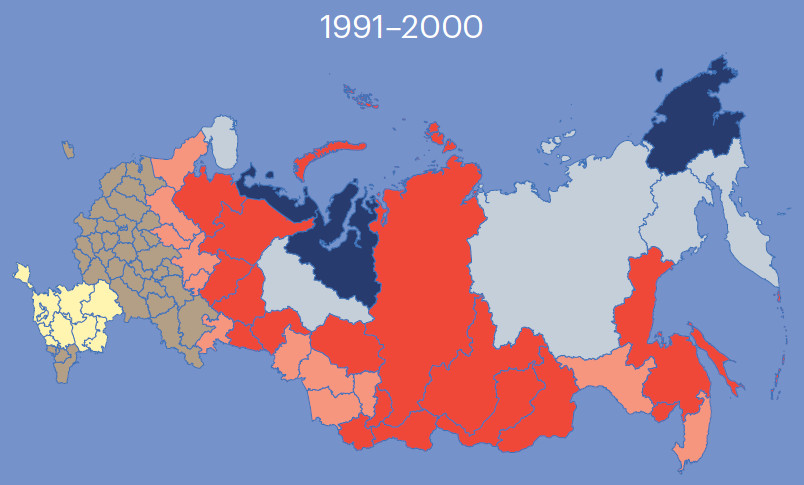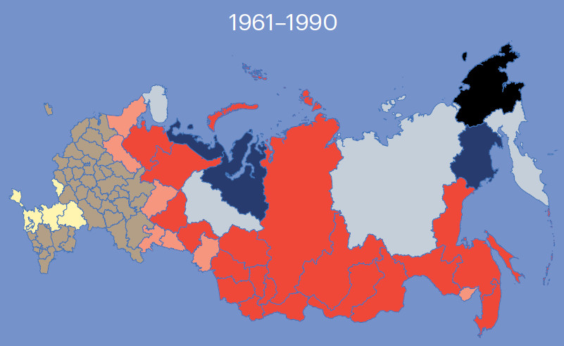 *Использованы данные о численности населения в регионах РСФСР/РФ по итогам переписей 1959, 1970, 1979, 1989, 2002, 2010 гг. и текущие оценки Росстата на 2020 г.