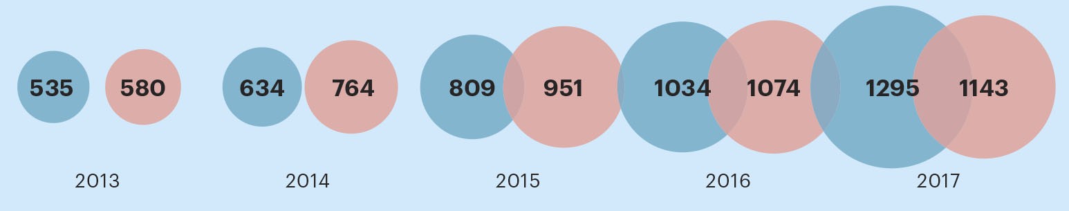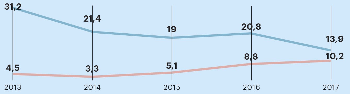 Постепенно X5 Retail Group вернула себе утраченные позиции: в конце 2016 года она обошла «Магнит» по размеру квартальной выручки, а окончательно вышла на позицию лидера продуктовой розницы по итогам 2017 года, в котором доля X5 составила 9,5% против 7,5 у «Магнита». И, конечно, опередила конкурента по размеру годовой выручки — 1,29 трлн руб. против 1,14 трлн руб. у «Магнита».