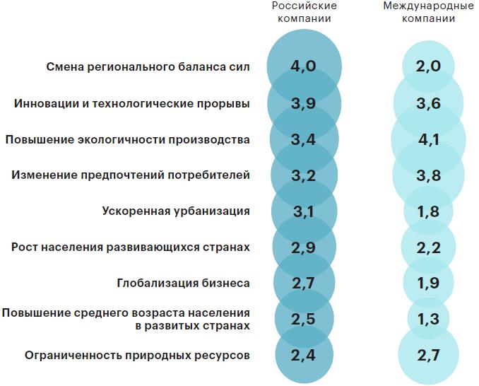 ***Средняя оценка влияния мегатрендов по мнению руководителей российских компаний и на основании инициатив и проектов международных компаний, по пятибалльной шкале.