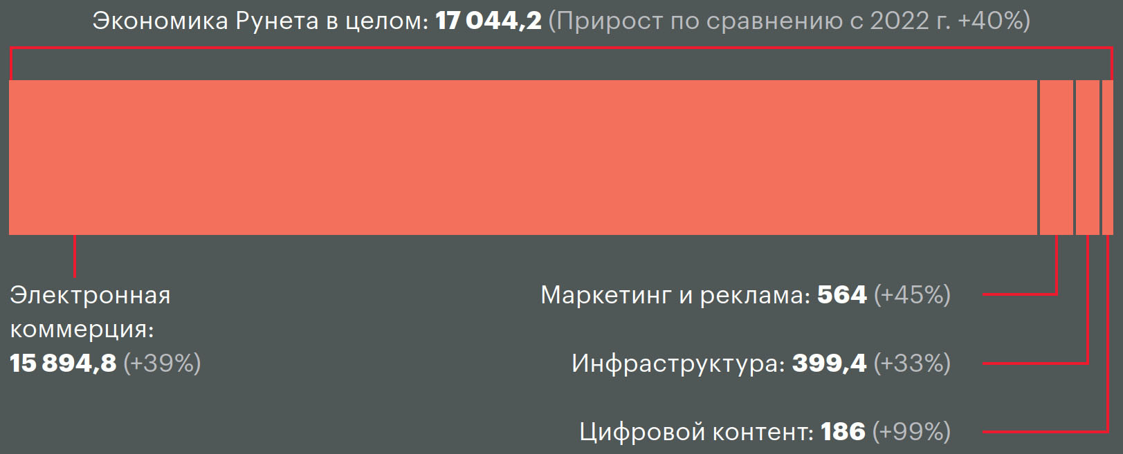Крупнейший вклад в российскую интернет-экономику вносит электронная коммерция — на нее приходится доля в 93%. Объем сегмента в 2023 году вырос на 39%, до 15,9 трлн руб.