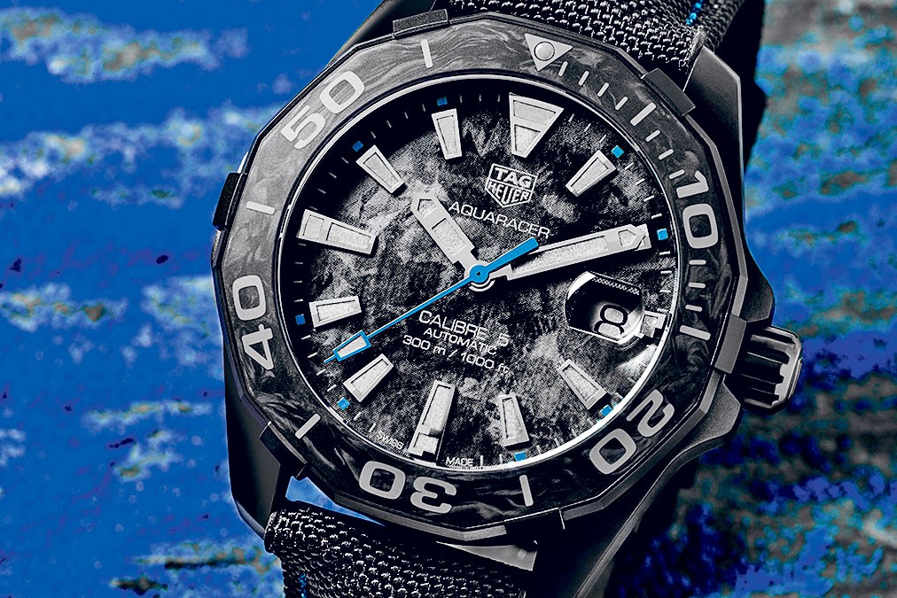 Три новые модели обновленной серии спортивных часов Carbon Aquaracer получили герметичный (погружение на глубину до 300 м) титановый корпус с PVD-покрытием, из карбона изготовили безель. Кристаллический узор «под углеволокно» на циферблате сделан методом тиснения, на этом темном матовом фоне у каждой модели Aquaracer расставлены свои цветовые акценты — синие, желтые и оттенка розового золота. Автоматический калибр TAG Heuer 5 управляет работой трех стрелок и индикатора даты.