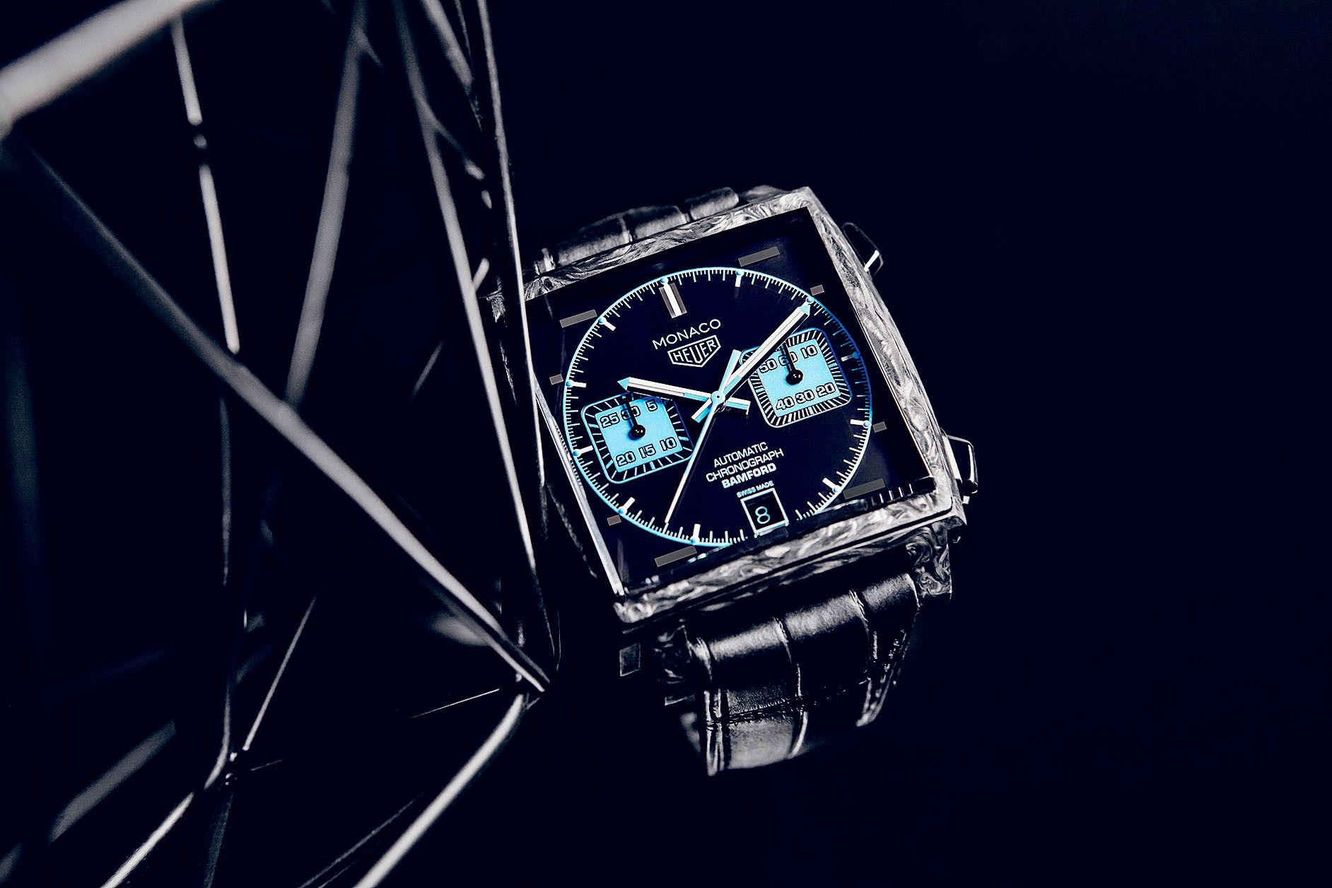 «Карбоновая лихорадка» началась с культового квадратного хронографа TAG Heuer Monaco, ставшего одним из открытий базельской выставки 2018 года. Модель была разработана совместно с британской компанией Bamford Watch Department, которая специализируется на индивидуальных заказах для крупных часовых брендов. В бликующий матовый квадрат карбонового корпуса заключен черный опаловый циферблат с яркими деталями цвета AquaBlue, скрывающий под собой автоматический калибр 11.