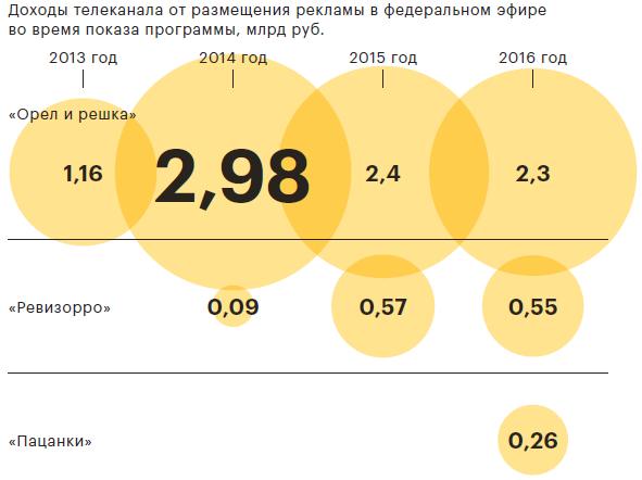 В премьерном для «Пятницы!» 2013 году шоу «Орел и решка» вышло в эфир 1088 раз. Доля проекта составила 2,4 против 1,7% у канала в среднем, подсчитала для журнала РБК компания Mediascope. С каждым годом популярность шоу росла: на конец 2016 года доля составила 3,3 против 2,9% у «Пятницы!» в среднем. По итогам 2016-го рекламная выручка канала от проекта (без учета спонсорской) составила 10,5 млрд руб., подсчитали для журнала РБК аналитики агентства Etat Control International (ECI). Больше всего на рекламе в «Орле и решке» канал заработал в 2014 году — 2,9 млрд руб.
