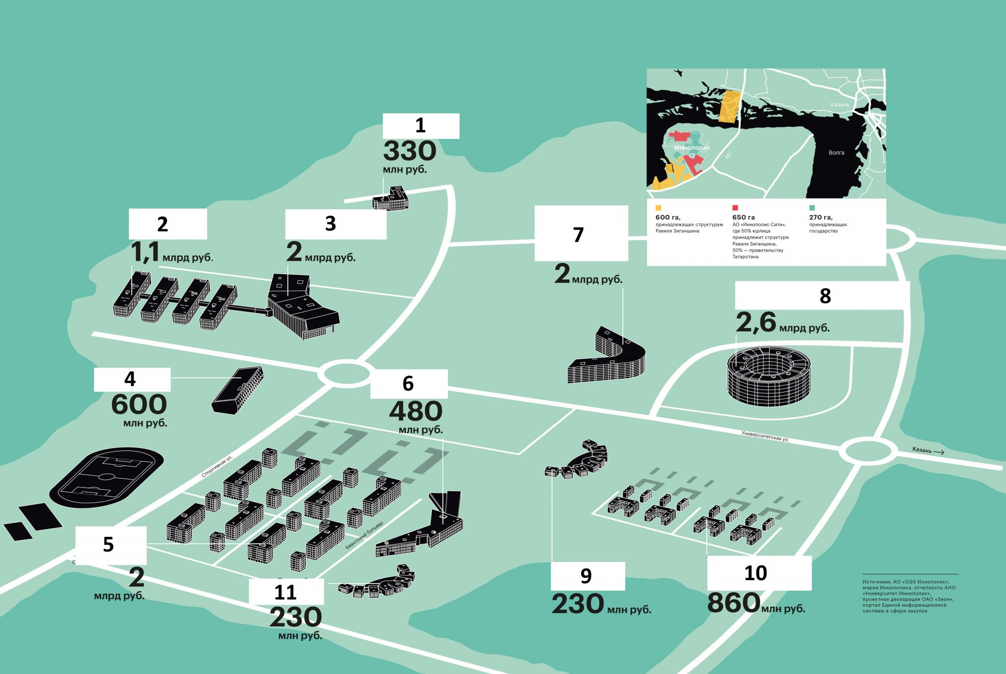Источники: АО «ОЭЗ Иннополис», мэрия Иннополиса, отчетность АНО «Университет Иннополис», проектная декларация ОАО «Зион», портал Единой информационной системы в сфере закупок