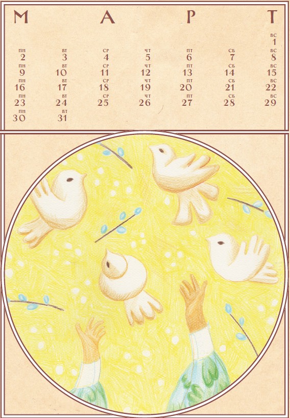 В марте все не успеть: солнце встает все раньше, и две с половиной минуты, топящие квартиру в меде и янтаре, вдруг уползают за границу будильника. Ты просыпаешься, все уже пропустив — свет зимний, какого-то рисового оттенка, земля сердито спит в мерзлом налете, похожем на молочную пенку. Из луковиц супермаркетных гиацинтов режутся зеленые их клык и: так жадно и стремительно, что вот-вот разорвут свои пластмассовые стаканчики. В марте ты чуть шатаешься, висишь на одной петле, нуждаешься в весенней починке. Важно найти силы испечь жаворонков в равноденствие: постное тесто восхитительно пахнет дрожжами, липнет к рукам теплой тяжестью — тянучее, в прорехах. В печке эти плохо завязанные узелки вдруг оформляются в птиц — диковинных и нелепых. Отвернешься налить чаю — они спархивают с тарелки прямо во двор, где дворник несет ведра красить оградку. Это они расчертят асфальт цепочкой радужных следов.