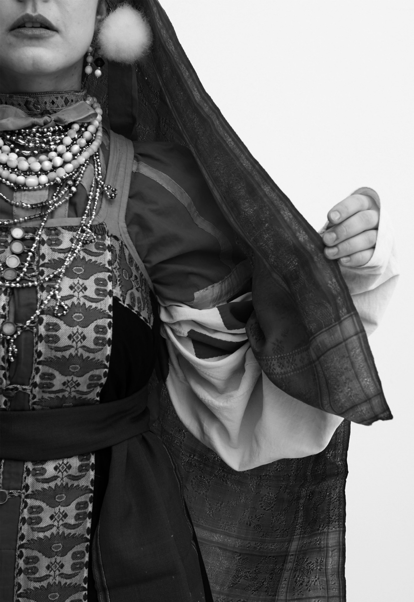 Первый язык народного костюма звучит громко, рассказывая о достатке и благополучии. Это культура престижа, без которой нельзя понять избыточную роскошь русских нарядов. По наряду жены судили о богатстве ее мужа, а одежда девушки позволяла представить достаток ее родителей и размер приданого. Восточные шелка, шитье золотом и жемчугом, драгоценные ювелирные украшения — все это находило свое место, подчиняясь сложившемуся канону. Такие предметы одежды, ставшие маркерами престижа, накапливались поколениями и пускались в ход тогда, когда нужно было произвести должное впечатление. Не ради бахвальства, а чтобы правильно устроить свою жизнь: девица на выданье наряжалась, чтобы хорошо выйти замуж, молодая жена — чтобы показать успешность новой семьи, а взрослая баба — чтобы найти достойные брачные партии детям. Если у девицы были старшие незамужние сестры, то даже это сообщалось в одежде, чтобы парни не спешили со сватовством раньше времени. Так складывались и не менялись веками статусные костюмы для особых случаев. Ну и по русской традиции всегда в костюме показывался не тот достаток, который есть, а тот, которого себе желали, — даже не самые богатые крестьяне одевались чуть сверх своих возможностей. И если престижного атрибута не хватало, не зазорно было его одолжить — правила игры понимали все, и порой невеста отправлялась под венец, собрав наряд по всему селу, но гордо заявляя, каким она представляет свое будущее благополучие.