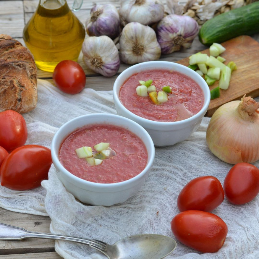 Легкий летний суп из перетертых овощей. Его основа — спелые, ароматные томаты, огурцы, кусочки белого хлеба, чеснок, оливковое масло и лед. В некоторых вариациях рецепта добавляют кабачки, сладкий перец, тыкву и лук-шалот.