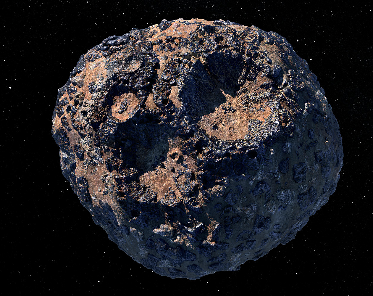 Астероид: (16) Психея. Орбита: главный пояс астероидов, в 2,5–3,3 раза дальше от Солнца, чем Земля. Размеры: 278х232х164 км; масса: 23 000 трлн т. Вращение: годовой оборот – 5 земных лет, вокруг своей оси – 4,2 ч. Состав (предположительно): железо, никель, силикаты, платина и другие благородные металлы