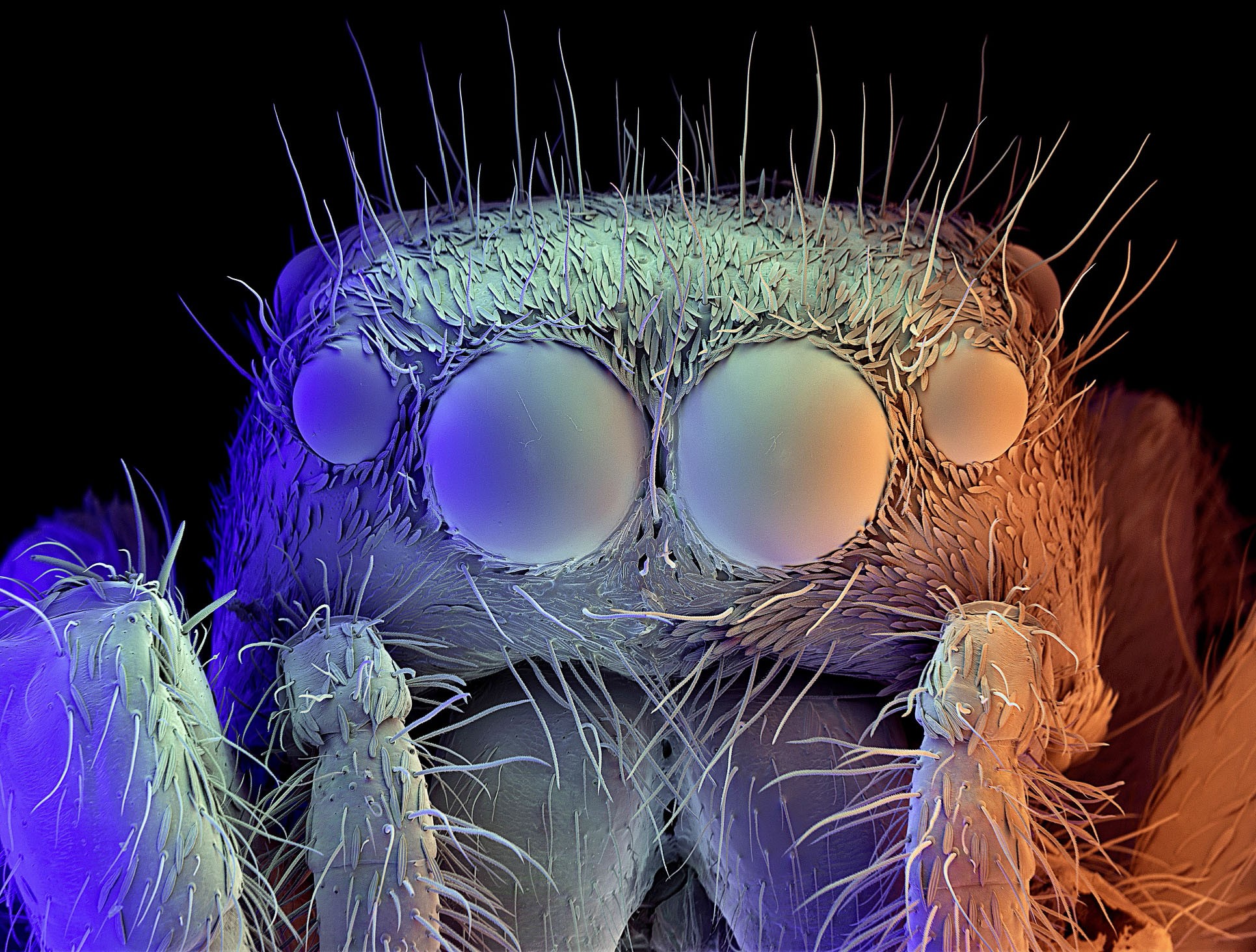 У большинства пауков глаза устроены просто: зачем острое зрение тому, кто проводит значительную часть времени, сидя на паутине? Однако есть виды, которые отказались от плетения сетей, обзавелись яркой окраской и сложным поведением. Так, пауки-скакунчики (Salticidae) всегда в движении: прыгают с травинки на травинку, высматривая добычу или партнера для спаривания. У них, как и у большинства других пауков, восемь глаз: два расположены по бокам, пара направлена назад, еще две — вперед. И если боковые и задние различают лишь свет, тень и резкие движения, помогая животному спасаться от врагов, то передние глаза, самые крупные, — это оптический прицел для охоты.