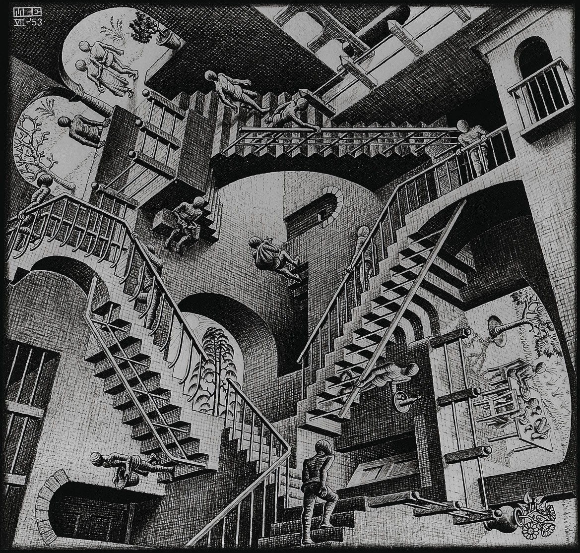 «Я не могу удержаться, чтобы не посмеяться над нашими непоколебимыми истинами. Например, это подлинное удовольствие свободно путать двумерность и трехмерность, плоскость и пространство или сыграть шутку над силой притяжения. Вы уверены, что пол не может быть потолком?» — говорил сам Эшер. После того как ему пришлось уехать из Италии, художник, лишившийся любимых ландшафтов, переключился с изображения внешнего мира на воплощение собственных фантазий. Одна из таких «игр со зрителями» — гравюра «Относительность». «Мы видим, как наверху два человека идут рядом по лестничным ступенькам будто бы в одном направлении, — комментировал художник эту работу, — тем не менее один движется вверх, а другой вниз. Контакт между этими людьми невозможен, так как они живут в разных мирах и не подозревают о существовании друг друга». Ученые же считали визуальные парадоксы Эшера отличными иллюстрациями научных теорий. По словам британского математика и физика Роджера Пенроуза, именно «Относительность» произвела на него наиболее сильное впечатление, когда ученый впервые увидел гравюры Эшера в 1954 году в Амстердаме. После этого Пенроуз всерьез заинтересовался невозможными фигурами, подружился с художником и, в свою очередь, повлиял на его творчество.