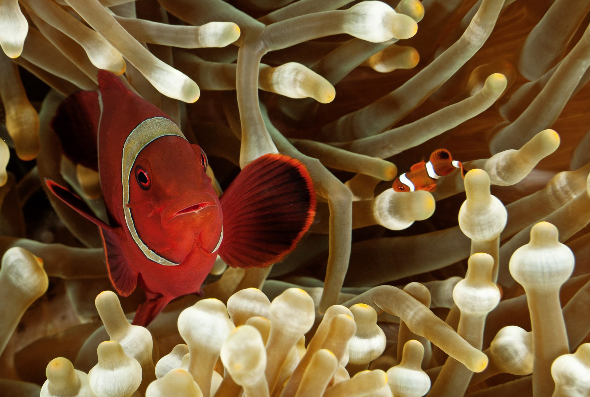 Но рыбы-клоуны зашли в этой дружбе особенно далеко, научившись имитировать состав слизи актиний, благодаря которой те не жалят сами себя. Это позволяет рыбке спокойно укрываться среди смертельно опасных щупалец. Устроившись, она агрессивно оберегает «свою» актинию от посягательств соперников, очищает ее от остатков пищи и вентилирует, обеспечивая приток свежей воды и питания.