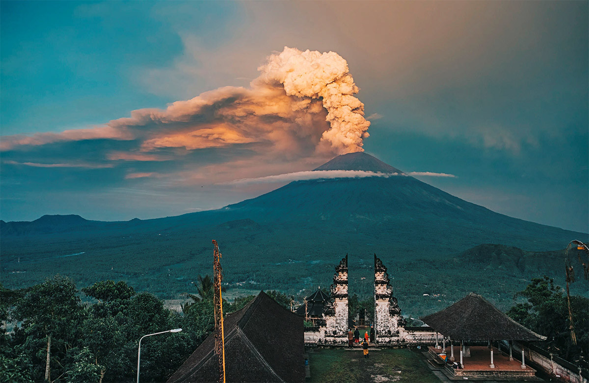 Толчок, еще один. Звякает ложка, лежавшая на блюдце. Официантка, разливавшая кофе по чашкам, извиняется за несколько капель, упавших мимо. «Почувствовали?» – с улыбкой говорит мой собеседник, молодой балиец по имени Команг. Мы сидим на открытой террасе кафе с видом на рисовые чеки, ступенями поднимающиеся к самым облакам. За облаками виден идеальный конус Агунга. Полускрытая утренней дымкой громада высотой 3142 метра словно парит над пейзажем. Команг подходит к краю террасы и показывает наш будущий путь: «Мы спустимся вниз в долину к полям, потом перейдем вброд реку и по рисовым террасам поднимемся вверх по склону вулкана, где расположен один из деревенских храмов. Вы знаете, что Агунг священная гора для балийцев? На горе построены десятки храмов. Среди них самый большой и важный религиозный комплекс Бесаких, расположенный ближе всех к кратеру. Каждый балиец должен хотя бы раз в жизни побывать на этом вулкане».