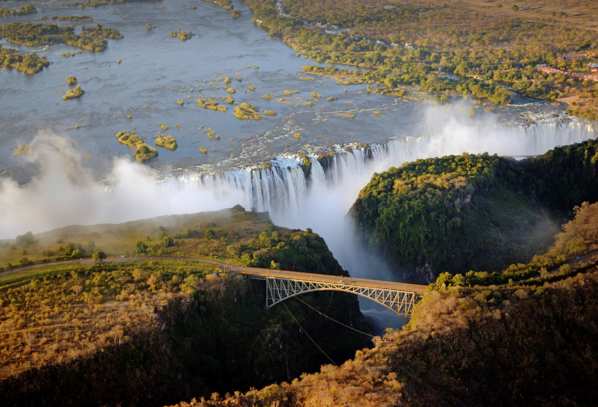 Идея железнодорожного моста через Замбези, где проезжающие поезда «будут ловить брызги водопада», принадлежит британцу Сесилу Родсу, империалисту и «архитектору апартеида». Его планом было построить железную дорогу через всю Африку, от Кейптауна до Каира. План провалился, но не целиком. В 1905 году был открыт Victoria Falls Bridge, правда не Родсом, который к тому времени умер, а сыном Чарлза Дарвина Джорджем. Сейчас по мосту Водопада Виктория, кроме поездов, движутся автомобили и пешеходы, для которых организуются экскурсии. С одной стороны – зимбабвийский город Виктория-Фолс, с другой – замбийский Ливингстон. Есть бесплатный музей и площадка для банджи-джампинга (на высоте 111 метров над водой), куда приходит множество желающих посмотреть на отчаянных прыгунов, которых тоже немало.