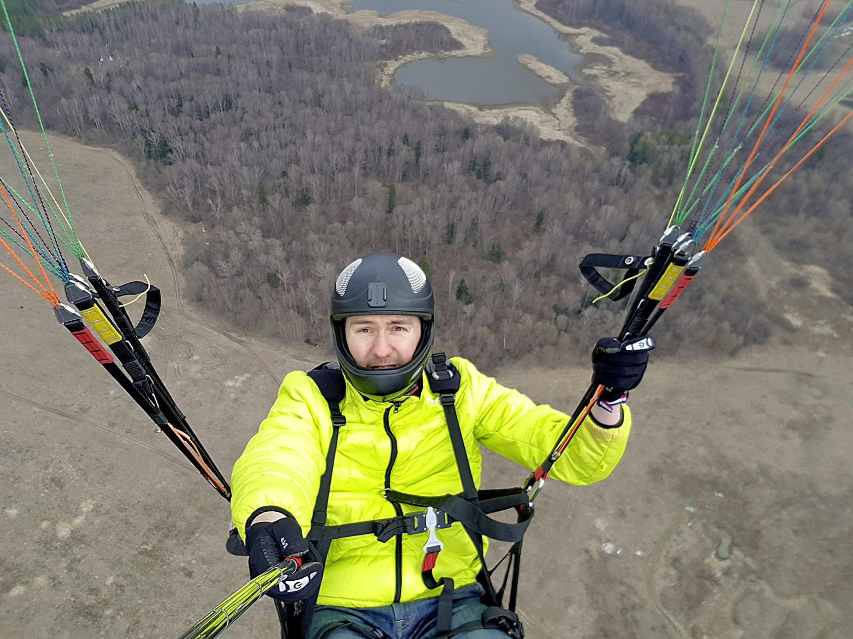 На фото у меня испуганное лицо, потому что я боюсь потерять телефон. Гаджет с рабочими заметками, диктофонными записями и сотнями семейных фотографий, которые я не удосужился сохранить в облаке, вот-вот упадет с полукилометровой высоты. Летать на параплане совсем не страшно, я занимаюсь этим давно. А вот сделать «себяшку» в полете решил впервые, специально для номера про селфи. И нет бы подготовиться нормально: найти экшен-камеру и надежный штатив, привязать все это к себе страховочной стропой. Вместо этого я взял дешевую селфи-палку, приделал к ней телефон и сунул эту шаткую конструкцию в незастегивающийся карман. Через несколько секунд после того, как был снят этот кадр, телефон отвалился-таки от палки и упал мне на колени! Определенной категории людей, как говорится, везет.