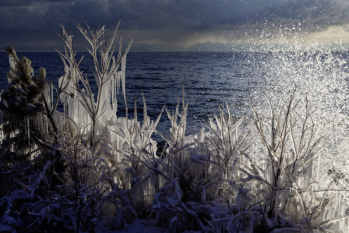 Торосы (на фото вверху) формируются лишь к февралю, когда толщина льда достигает полутора-двух метров. А вот сокуи (фото внизу) можно наблюдать уже осенью. Этот вид льда образуется от приплесков волн на скалах и камнях. При сильном ветре прибрежные скалы могут покрываться приплесковым льдом на высоту до 10 метров. Снизу – грот-пещера в Чивыркуйском заливе, Забайкальский национальный парк.