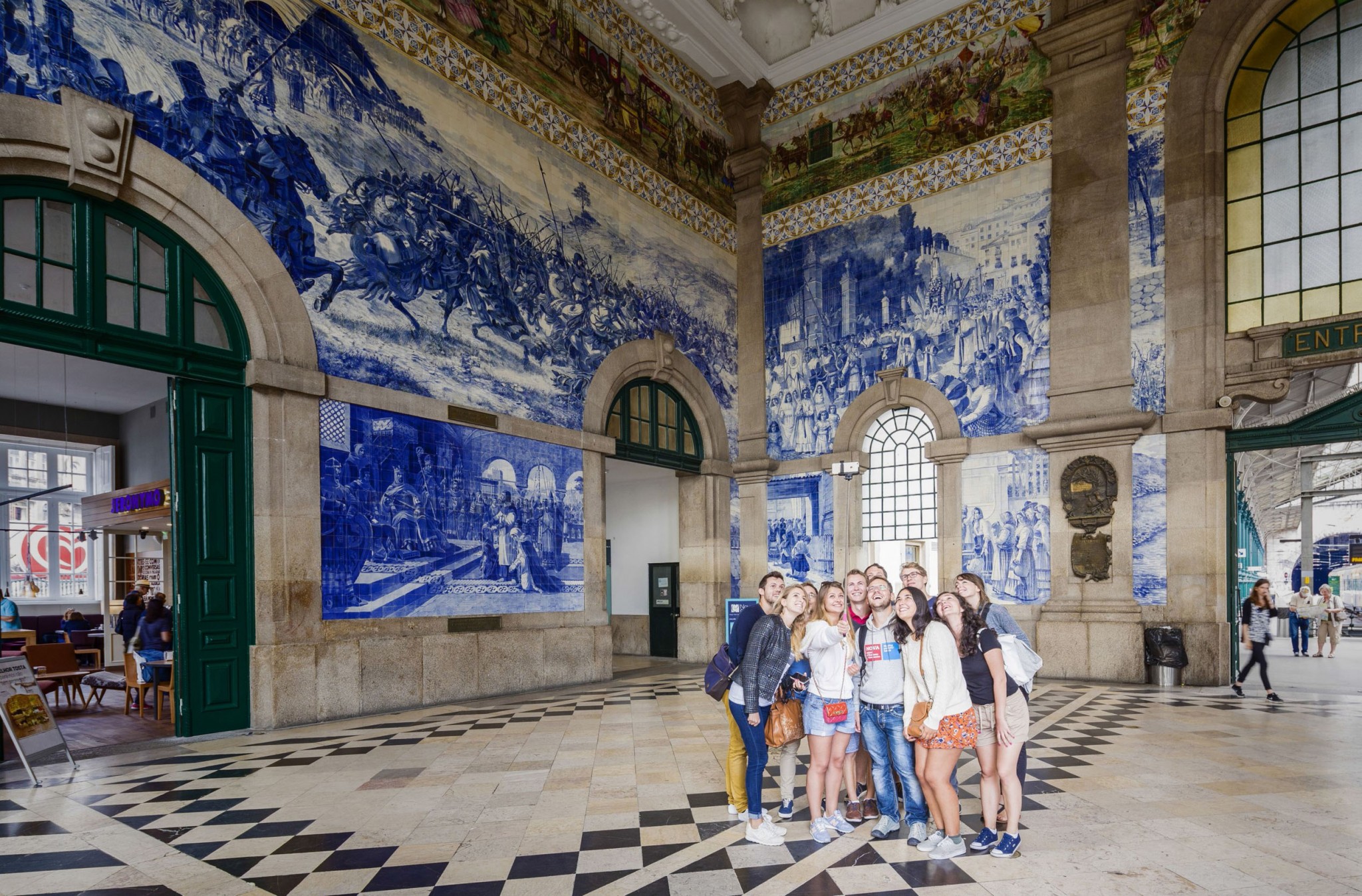 Когда гиды ведут туристов в здание вокзала пригородных поездов, расположенное в центре города, туристы плохо понимают зачем. Но, оказавшись внутри, буквально забывают дышать: вестибюль больше похож на галерею монументальных полотен из плитки азулежу — пейзажи, сцены героических сражений и сельской жизни, история транспорта… Около 20 тысяч плиток, покрывающих площадь в 551 м², были созданы более ста лет назад лучшим португальским художником азулежу Жорже Коласу.