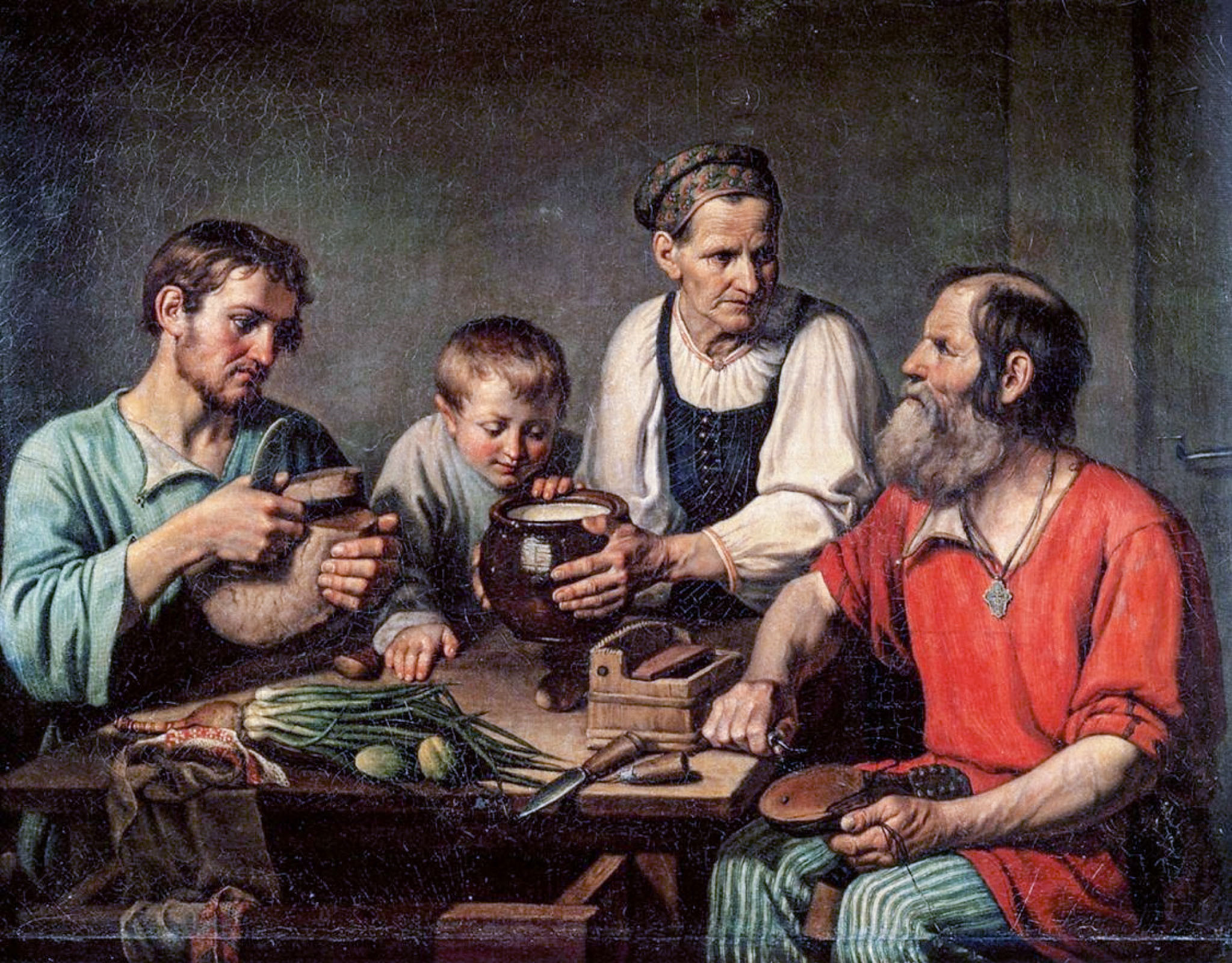 Земледельцы унаследовали от предков выращивание злаков: пшеницы, ячменя, проса. С XI в. появляются рожь и овес. Видимо, при татаро-монгольском нашествии – гречиха. Из злаков пекли хлеб и варили каши. Хлеб был главным источником калорий, что отразилось в пословице: «Хлеб на стол, так и стол престол; а хлеба ни куска – так и стол доска». Из овощей уже в XIV в. выращивали репу, капусту, морковь, лук, чеснок, горох. Варили пустые щи и забеливали их сметаной. Молока хватало летом, когда скот был на выпасе. К весне же ослабевшая от скудного корма корова давала столько молока, сколько сейчас дает хорошая коза. Мясо ели обычно лишь по праздникам. Иногда весной приходилось забивать телят, которых нечем было кормить. Тогда на стол попадало нежданное мясо.