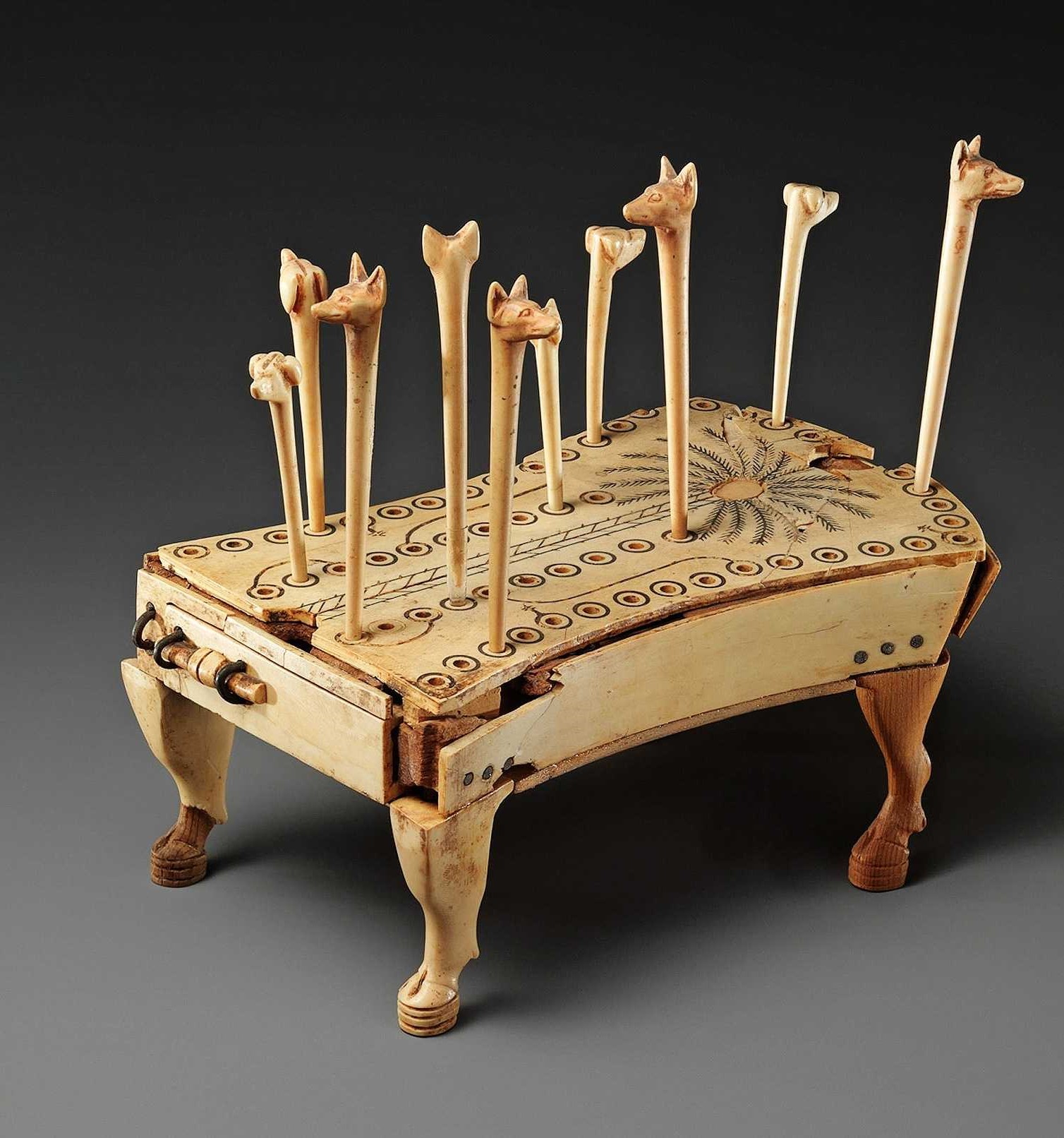 У древнеегипетской забавы есть и другое имя: «58 дырочек». Правила ее доподлинно неизвестны, зато сюжет легко узнаваем. Изящные длинные палочки символизируют Анубиса — бога, покровительствующего умершим. Египтяне изображали его с головой шакала и телом человека. Те палочки, что покороче, смотрятся рядом с длинными, как женщина рядом с мужчиной. У них собачьи головы, как у богини Инпут, почитавшейся женой Анубиса. Их дочь Кебхут тоже богиня, подательница чистой прохладной воды. Ее изображали в виде золотой змейки или женщины с головой змеи. Змеевидные линии на игровой доске сокращают путь для фишек Анубиса и Инпут.