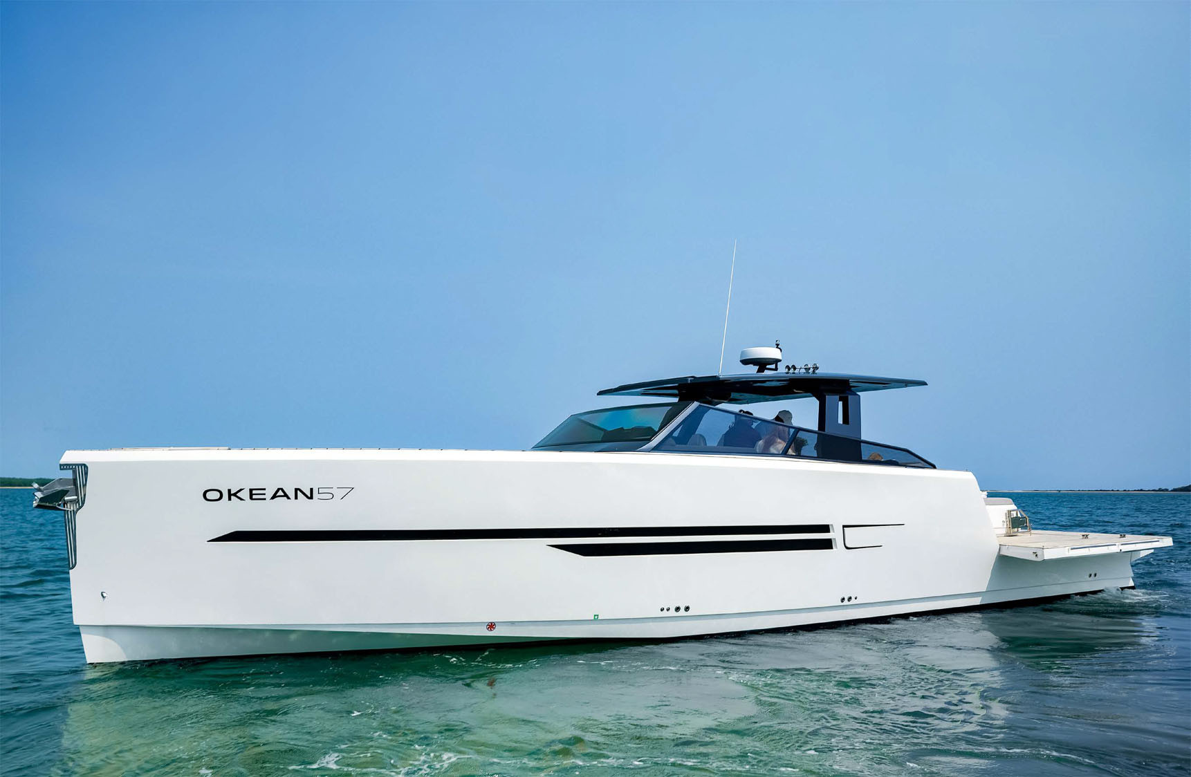 Яхты Okean отличаются нестандартным дизайном, и 57‑я это подтверждает. Ферраньи сформировал экстерьер этого круизера преимущественно прямыми, довольно резкими линиями, стараясь передать спортивность и динамику модели. У лодки почти отвесный форштевень, четкая линия фальшборта, «жесткий» угол перехода тонированного лобового стекла в хардтоп над кокпитом.