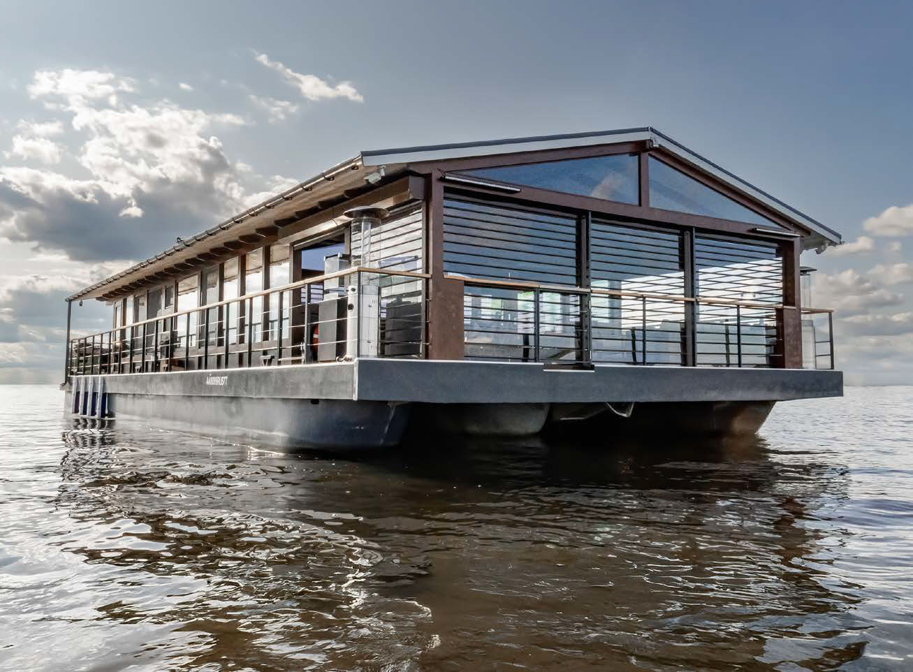 Классический хаусбот — это установленный на плавучее основание каркас дома, обшитый материалом, который отвечает функциональным и эстетическим запросам владельца. Предполагается, что дом на воде — все‑таки больше «хаус», чем «бот»: мы часто видим на выставках яхт, в московских и подмосковных яхт-клубах основательные двухэтажные сооружения, где люди если не живут постоянно, то проводят много времени, меняя пристани в зависимости от сезона. Хаусбот, на котором мы побывали, имеет один жилой уровень, широкие (около метра) потопчины по бортам, огромные окна, солнечные панели на крыше. Одним словом, заметно отличается от остальных.