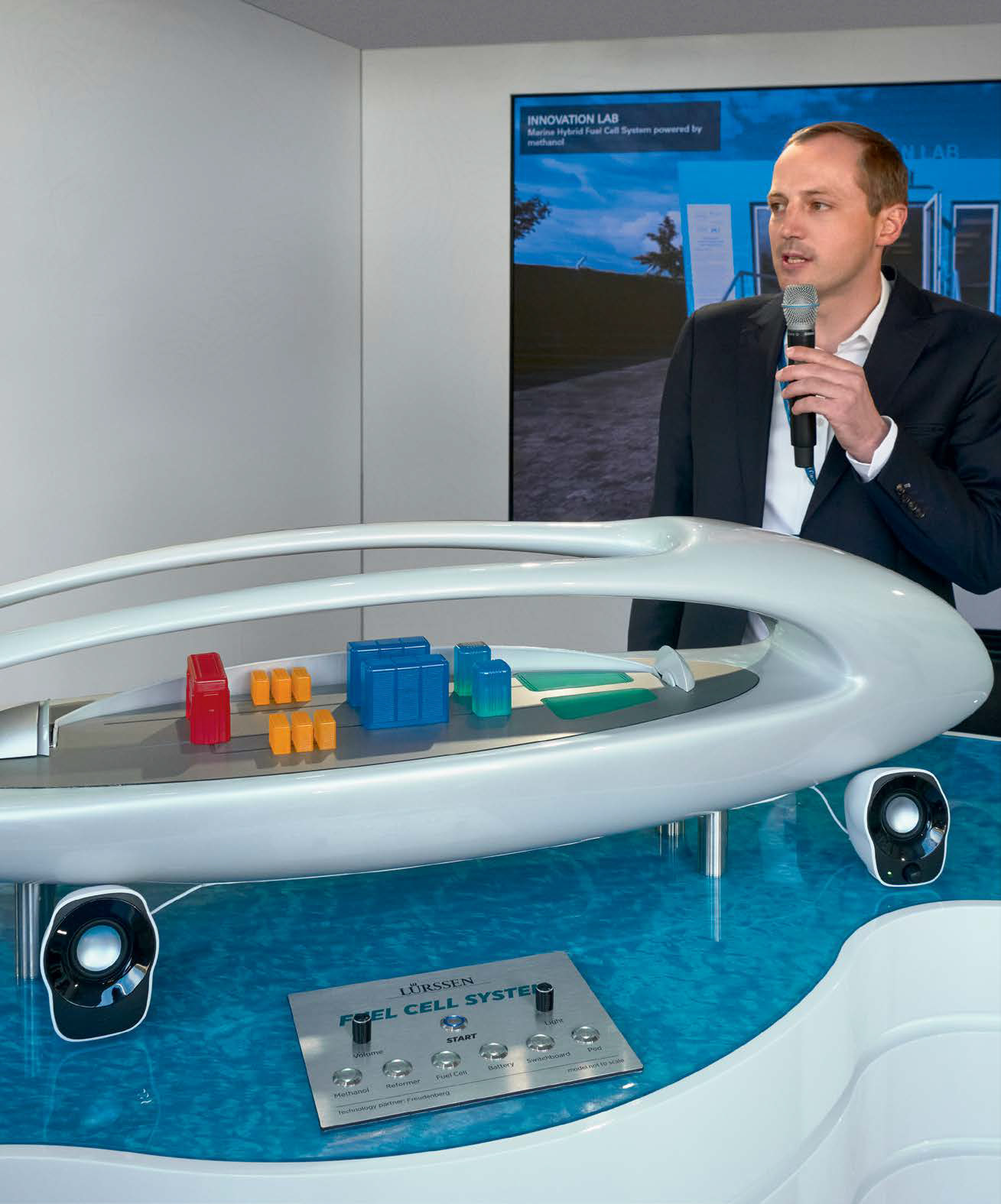 «Наша главная задача заключается в том, чтобы сделать судовые энергетические системы нейтральными по выбросам углерода, — рассказывает Юстус Райнке, управляющий директор Lürssen. — Вполне возможно, основным топливом будущего станет водород, причем в разных отраслях, не только в море. Но у водорода сравнительно низкая плотность энергии, и для его транспортировки нужны специальные емкости высокого давления, поэтому мы решили использовать в качестве носителя энергии метиловый спирт. Его можно хранить в обычных танках и на месте преобразовывать в водород с помощью парового риформинга. При этом тепло, необходимое для этого процесса, можно брать напрямую от самих топливных ячеек. Вырабатываемое ими электричество прежде всего будет использоваться для бытовых нужд, а излишки — для пропульсивных систем, например для азимутальных колонок».