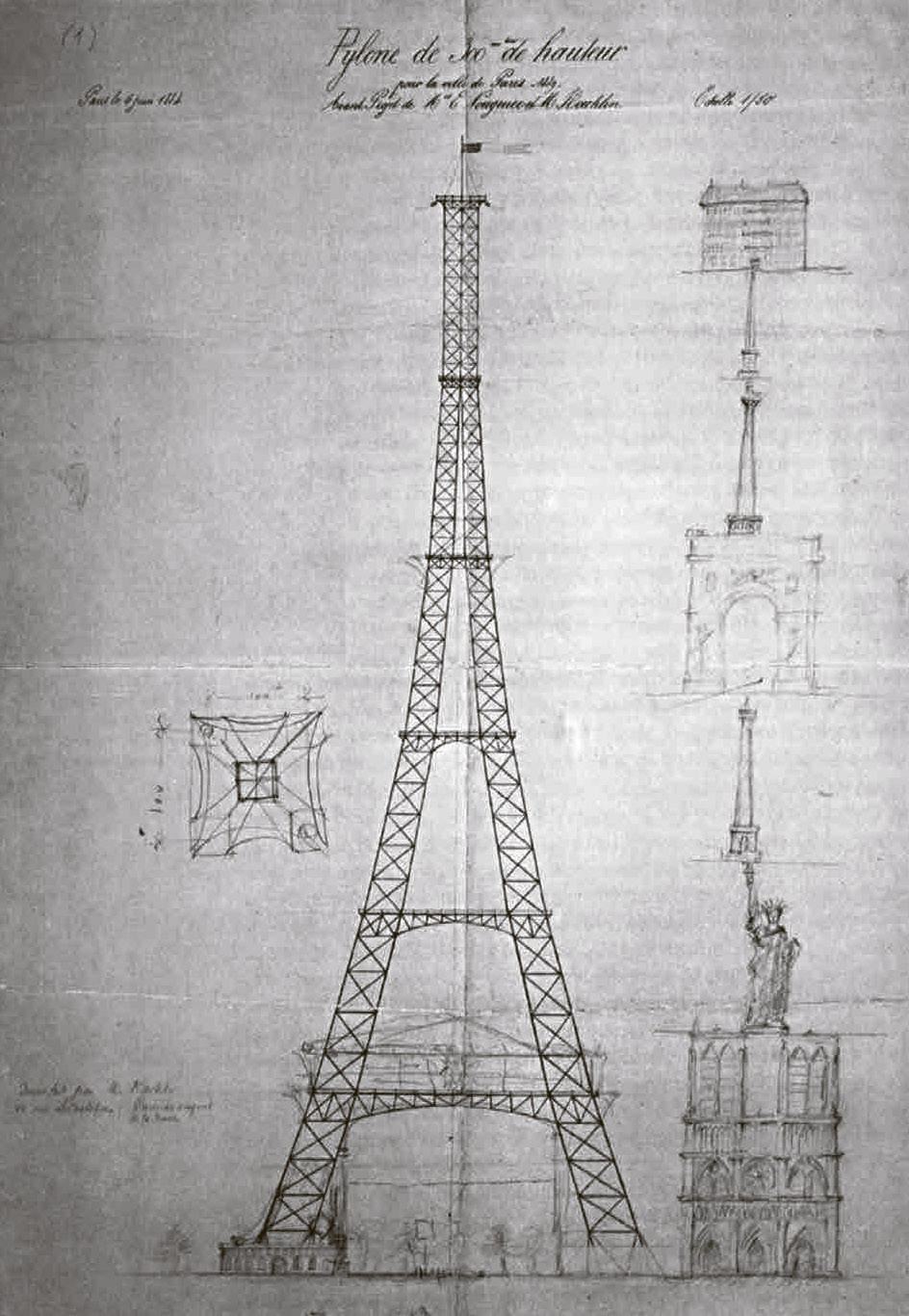 В 1851 году, по случаю открытия первой Всемирной выставки в Лондоне, был воздвигнут Хрустальный дворец – выставочный павильон из железа и стекла. Эта постройка произвела фурор. К открытию Всемирной выставки 1889 года в Париже, – а она проходила в столетнюю годовщину Французской революции, – хозяева едва не оказались в затруднительном положении. Они задумали возвести самое высокое здание в мире и самый большой по площади павильон, используя новейшие технологии строительства, прежде всего стальные каркасные конструкции. Времени оставалось немного, но они блестяще справились с задуманным. Шарль Фердинанд Дютер (1845—1906) и Виктор Контамен (1840—1893) построили Galérie des machines, Галерею машин, длиной 422 метра и высотой 47 метров, с максимальной шириной пролета 114 метров. А вот Гюстав Эйфель (1832—1923), прославившийся сооружением мостов из сборных металлических конструкций, возвел башню, ставшую символом не только Всемирной выставки, но и всего Парижа.